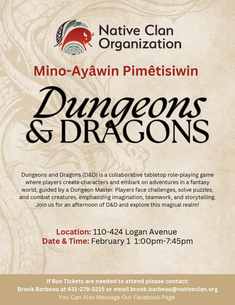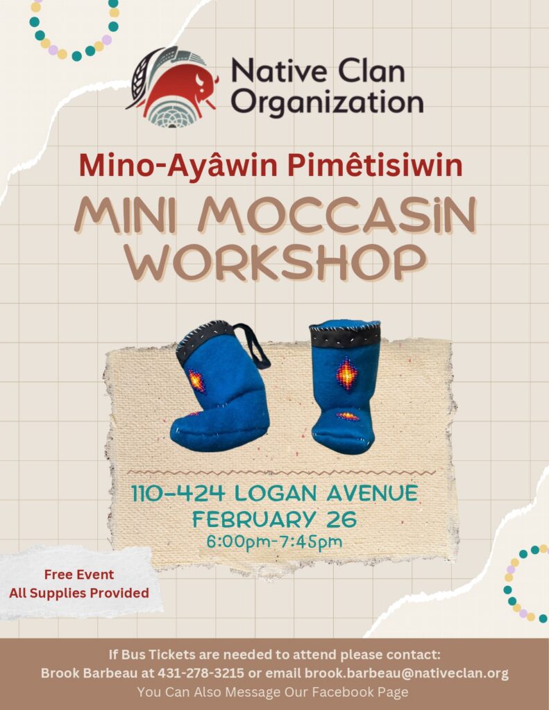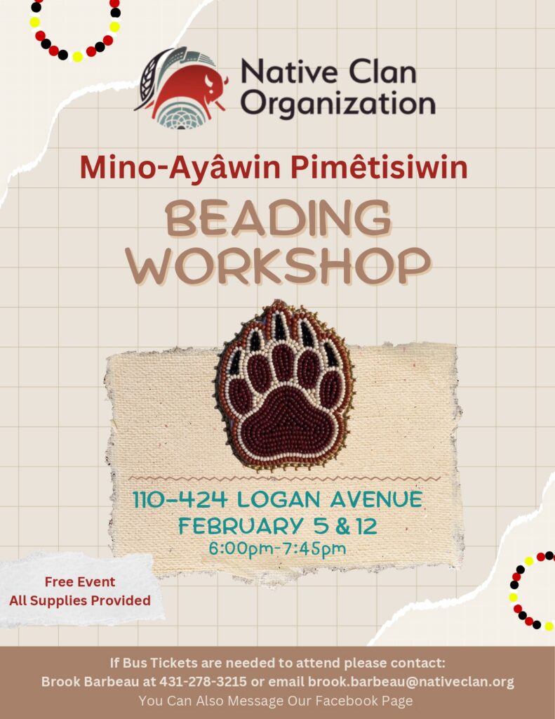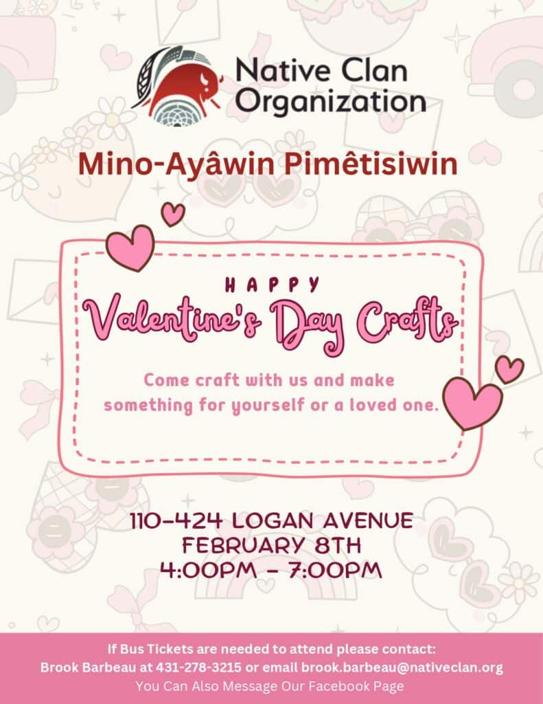 Native Clan Organization's Mino-Ayâwin Pimêtisiwin will be open for Drop-In Supports and a variety of Cultural Programs and Supports as reflected on the calendar. Mino-Ayâwin Pimêtisiwin programs is open to all Relatives and Community Members.